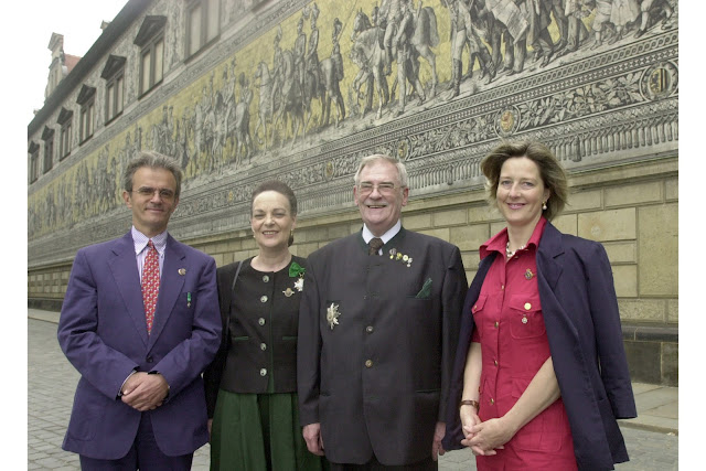 Specifically, those present at the gathering in Dresden were these members of the royal family: Prince Dedo of Saxony (1922-2009; he also acted as a representative for his brother, Prince Gero of Saxony [1925-2003], and for his stepmother, Princess Virginia of Saxony [1910-2002; née Dulon; widow of Prince Ernst Heinrich of Saxony]), Princess Erina of Saxony (1921-2010; née Eilts; widow of Prince Timo of Saxony), Princess Anastasia Luise of Saxony (b.1940; née Anhalt; wife of the late Margrave Maria Emanuel of Meissen, Prince of Saxony [1926-2016]), Prince Albert of Saxony (1934-2012), Princess Elmira of Saxony (b.1930; née Henke; wife of Prince Albert), Princess Maria Josepha of Saxony (1928-2018), Princess Maria Anna of Saxony (1929-2012), and Princess Mathilde of Saxony (1936-2018).